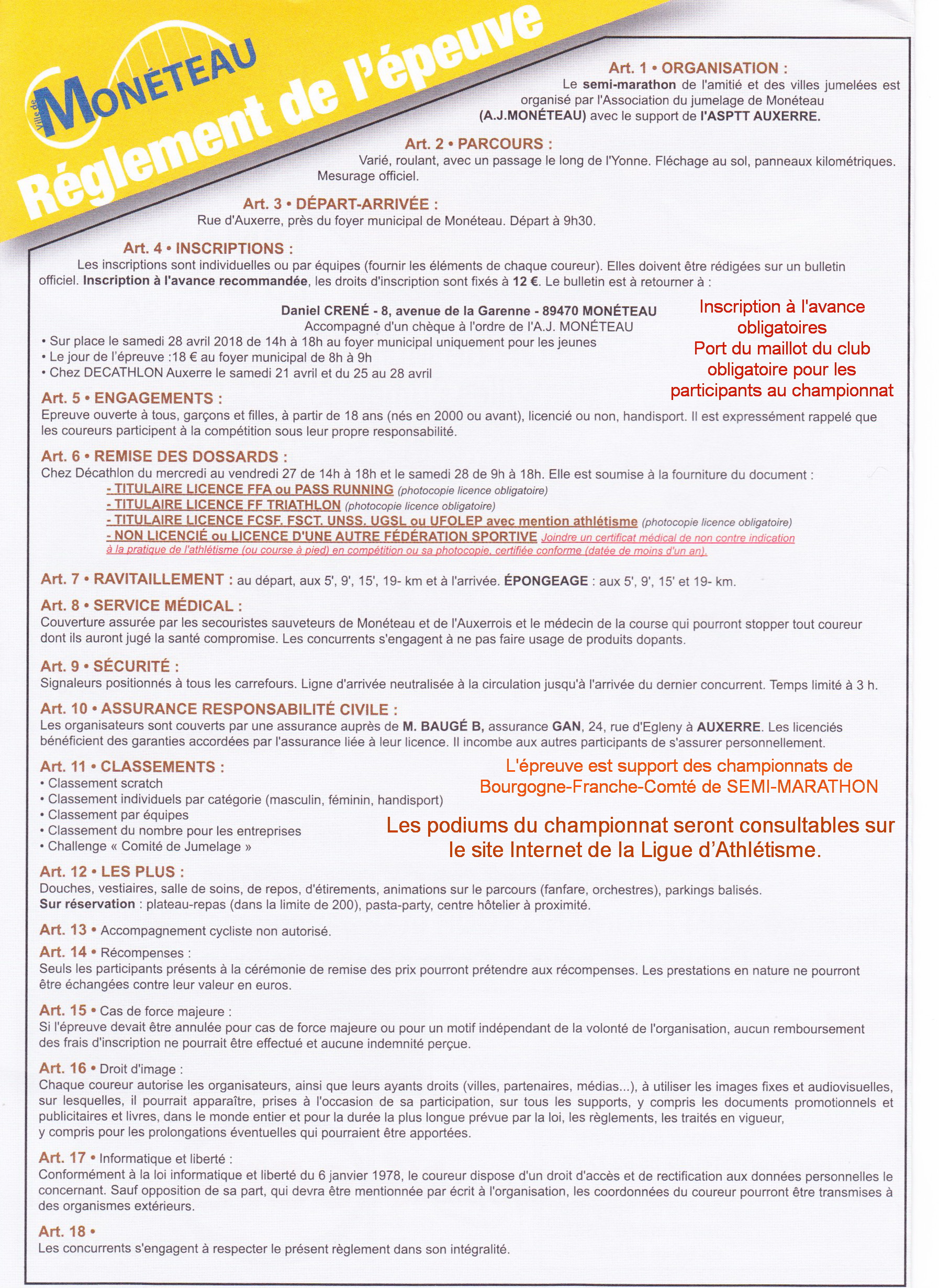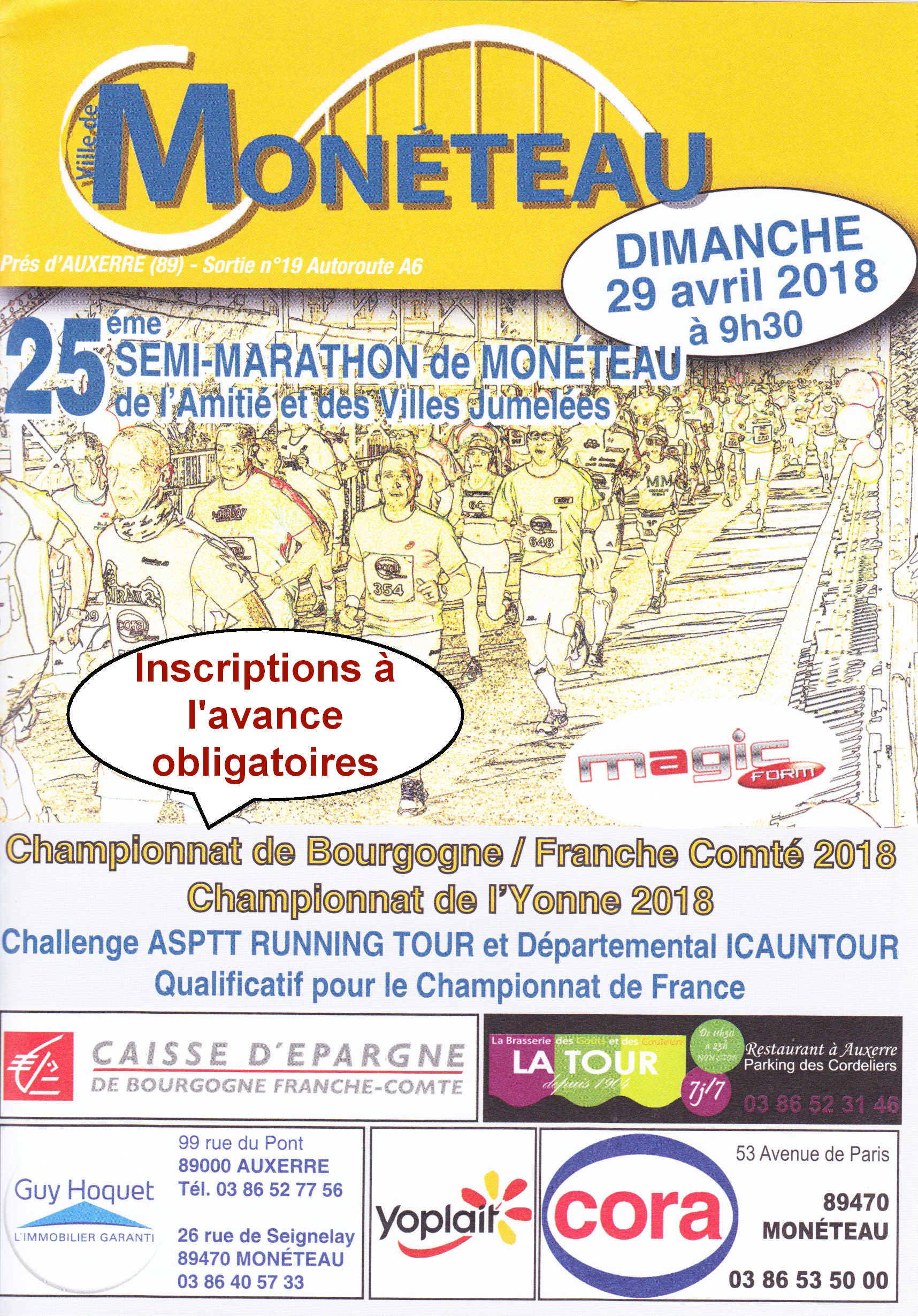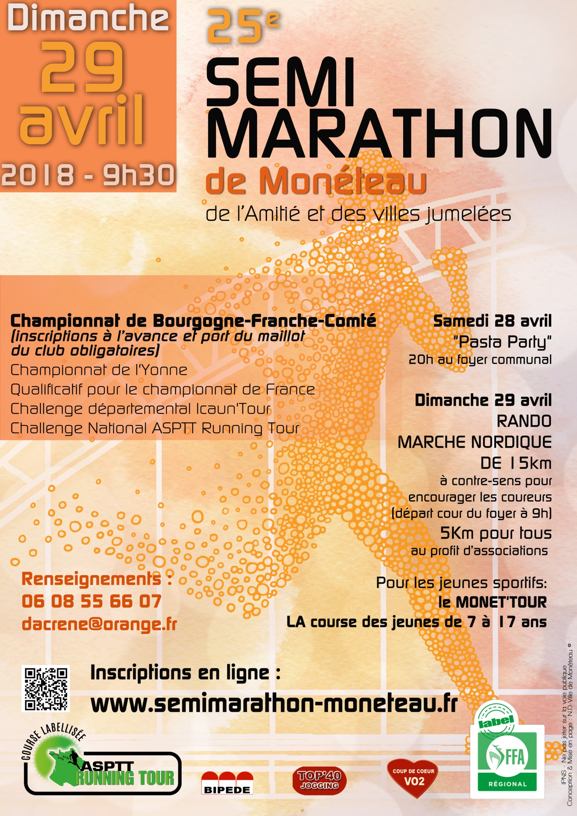 25ème Semi-marathon de l'amitié et des villes jumelées à Monéteau (89) à côté d'Auxerre. Parcours TOTALEMENT PLAT et 1 seule boucle. Label régional depuis plus de 15 ans, qualificatif pour le championnat de France. Support du championnat de BOURGOGNE-FRANCHE-COMTÉ et de L’YONNE et du 9ème ASPTT Running tour national, ainsi que du 6ème challenge départemental ICAUN’TOUR. Départ et arrivée au même endroit, route d’Auxerre à Monéteau C’est aussi un 15 km pour les cadets, des courses de jeunes dans toutes les catégories. En contre sens de la course c’est aussi une randonnée et une marche nordique d’environ 15 km. Pasta party le samedi soir et plateau après course (sur réservation). Daniel Crené 06 08 55 66 07; Email: dacrene@orange.fr; http://www.semimarathon-moneteau.fr La continuation des inscriptions et la remise des dossards se feront chez DECATHLON Auxerre du 25 au 27 avril de 14h à 19 h et le 28 avril de 9h à 18h. Le jour de la course, 29 avril, il est encore possible de s’inscrire (pour ceux qui ne participent pas au championnat de Bourgogne-Franche-Comté) au foyer municipal de Monéteau, route d’Auxerre de 7h30 à 9h. Les dossards pourront être retirés aussi à la même adresse le dimanche matin. Récompense au premier et à la première, ainsi qu’au 1er et 1ère locale, chaque fois pour 2 personnes, tout compris déplacement, hébergement, repas, inscription au 32ème semi-marathon et 10kms international de Trèves en Allemagne le dernier week-end de juin 2018. De nombreux bons d’achats de 50 € à 150 €. Récompense à tout le monde, sac garni, Tee-shirt technique, et un cadeau surprise aux 700 premiers inscrits à l’occasion de le 25ème édition.
